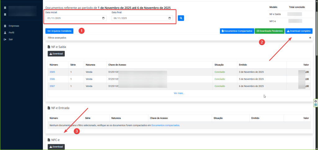- Download Completo: Baixa todos os arquivos fiscais emitidos pela empresa no período selecionado (incluindo NF-e, NFC-e, NFS-e, CT-e, MDF-e, etc.).