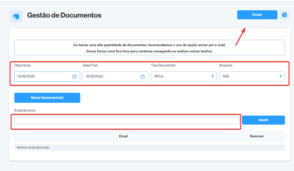 2 – Informe o período que deseja (geralmente o mês anterior), informe o tipo do documento (NF-e ou NFc-e), informe o email de envio (email da contabilidade) clica em inserir, e depois clicque em ENVIAR.