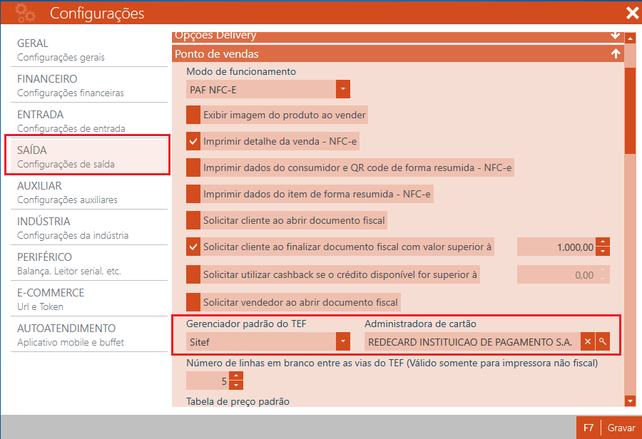 Acesse o menu Auxiliares > Configurações > Saída, clique no menu Ponto de Vendas, e no campo “Gerenciador padrão do TEF” selecione o Sitef. No campo ao lado indique a Administradora de Cartão cadastrada no procedimento anterior.