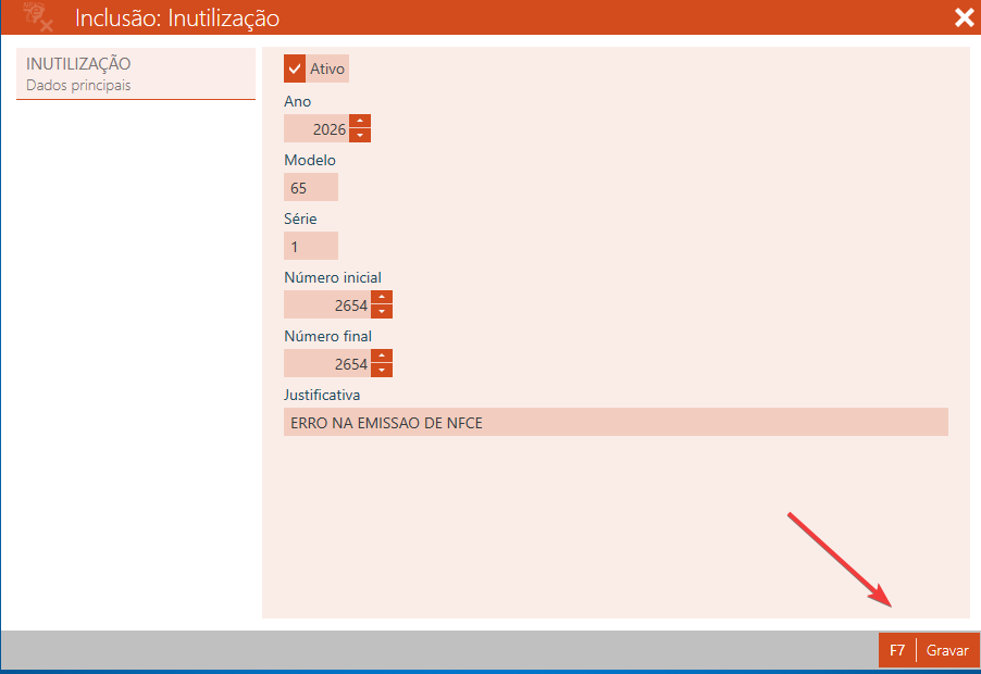 Preencha os campos, com as informações correspondentes ao cancelamento, conforme exemplo abaixo, cancelando um NFc-e, número 2654 e final o mesmo número, e informando a justificativa da inutilização, e após o preenchimento clique em GRAVAR