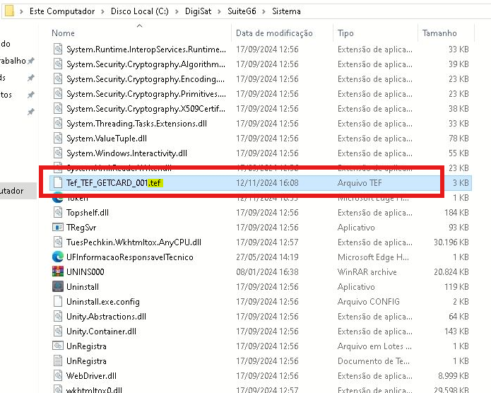 Deverá fechar o sistema e acessar a pasta C:\DigiSat\SuiteG6\Sistema e excluir o arquivo com extensão .tef